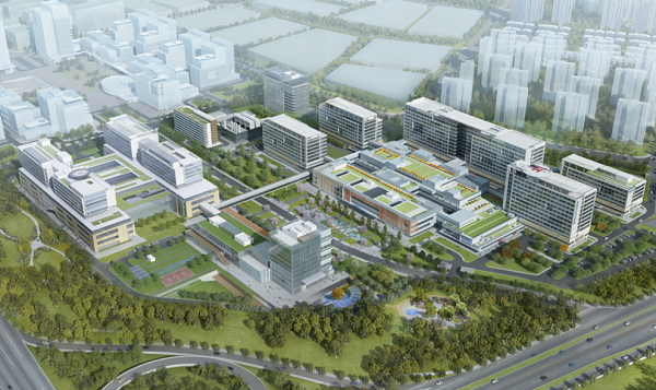 醫院建築由美國設計公司按照國際理念結合中國國情設計, 采用庭院式布局,著力營造自然療愈空間,采用大麵積采光使室內外環境渾然一體。醫院設置醫學轉化中心、模擬訓練中心、進修實習樓、學術報告廳、遠程教學中心,在門診和病區設置數字化MDT中心;配套建設人才公寓,設置員工活動中心和室內外運動場,為醫務人員創造安全舒適的工作、生活環境。